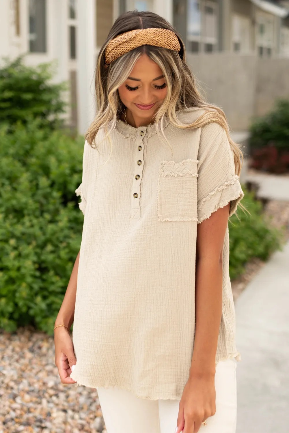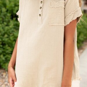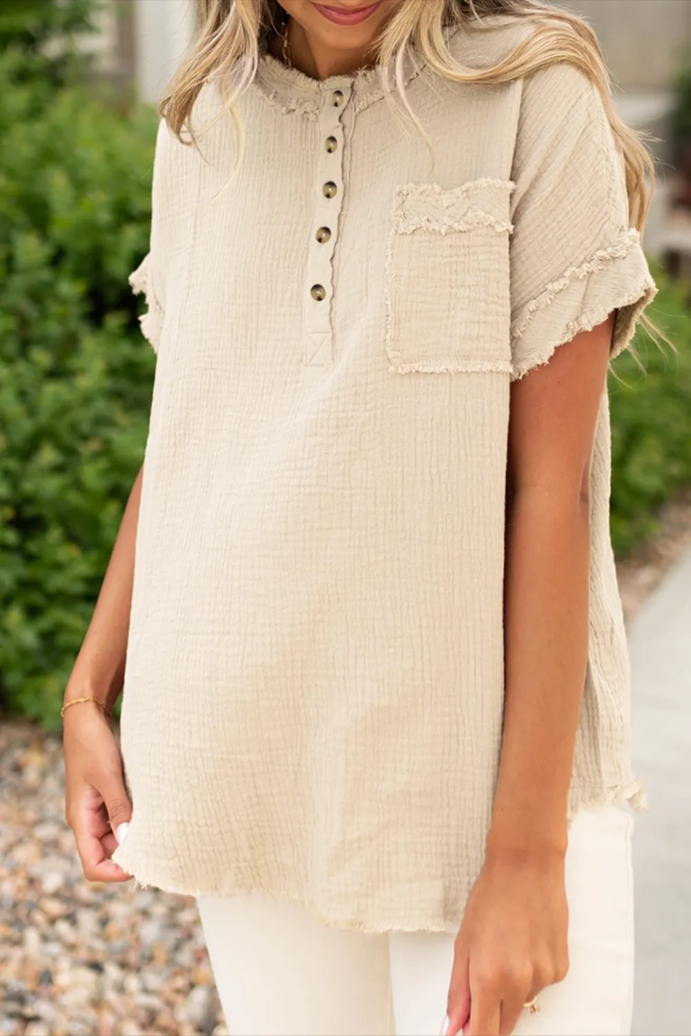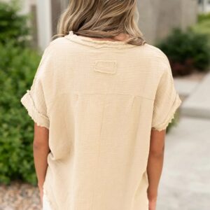 Parchment Crinkle Textured Frayed Trim Half Button Short Sleeve Top