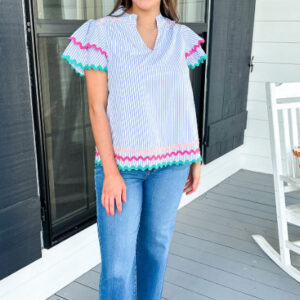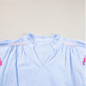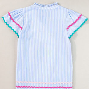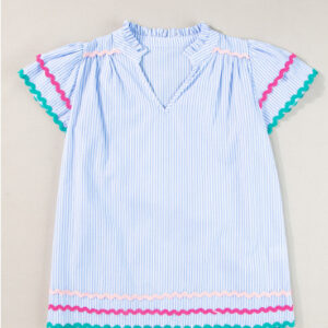 Be the first to review “Sky Blue Stripe Ricrac Trim Split Neck Striped Ruffled Sleeve Blouse”