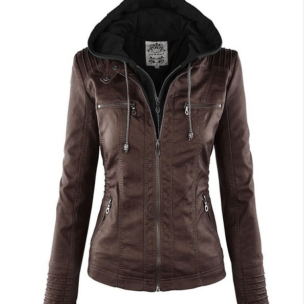Women’s Detachable Lapel Long Sleeve Solid Color Zipper Leather Jacket Coat